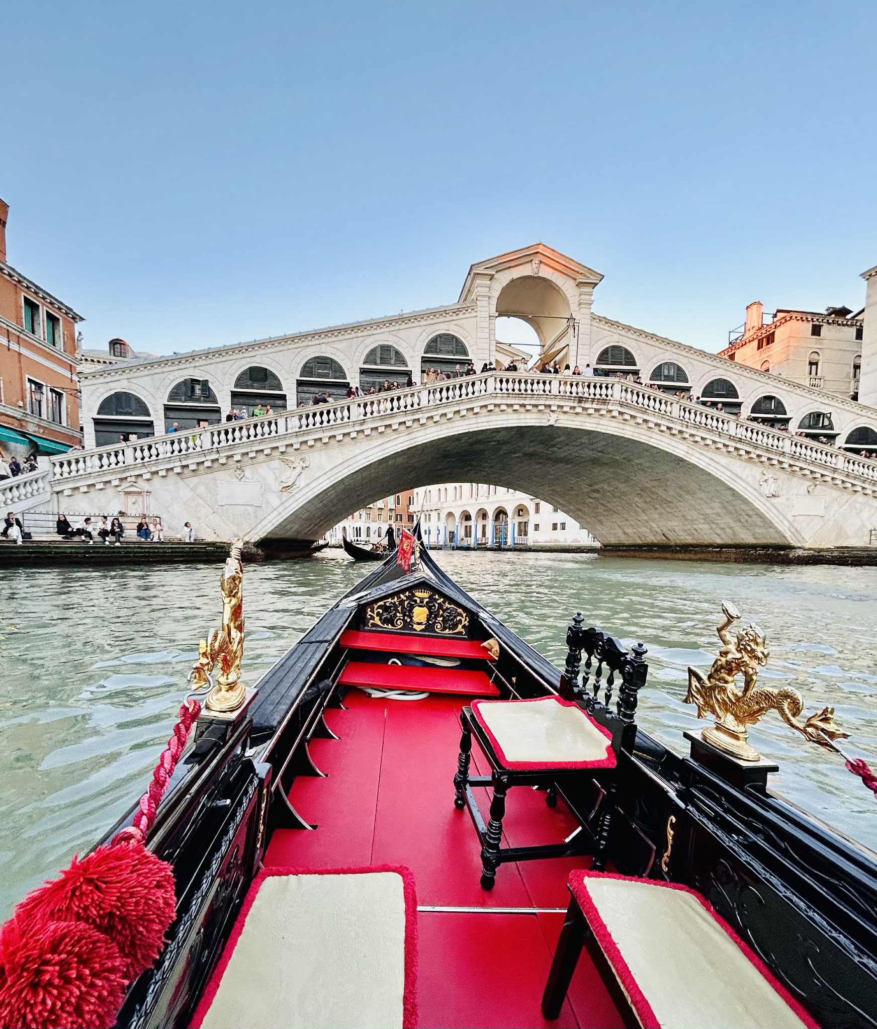Разходката из безбройните лабиринти на лагуната, изкачването на десетките мостчета, които свързват уличките над водата и провирането сред туристите изискват сериозни енергийни запаси. Затова е не желателно, а наложително преди това да се подкрепите с вкусна храна и напитки. Устремени към мостът Риалто, който свързва двата бряга на Канале гранде, и да следвате указателните табели, и да следите джипиеса, пак може да се изгубите. Както се случи и с мен. Заблеяна в омайващите постройки, притичваща по всяко зърнато малко мостче, доволна стъпих на Риалто, но установих, че съм сама. Телефонът си изгуби обхвата, а и от двете страни на моста и по самия него има толкова народ, че не може игла да падне. Когато най-сетне се свързахме, ни отне около 20 минути да уточним кой от коя страна на моста е. Крилатите лъвове не са желан ориентир, защото те са навсякъде по изумителната фасада на моста. За отправна точка ни послужи сватбената двойка, която позираше за фотосесия на една от рампите по канала. След като се намерихме единодушно определихме следващата стъпка в програмата – разходка с гондола. Прочутите венециански черни лодки с едно весло поемат максимално пет човека, освен гондолиера, който ги управлява. Затова се разделихме и останахме само двамата със съпруга ми в отделна гондола сами – с идеята да допринесем за романтичния дух на годишнината ни. Избрахме дългия маршрут из малките каналчета, но още с първото загребване се убедихме, че идиличната представа е изопачена. Гондолиерът не спря да ни говори и предлага да ни направи снимки, каналите ни се видяха твърде тесни, заради множеството плаващи гондоли наоколо. Преди всеки завой се чуваше шумно подвикване на гребците, за да се избегнат сблъсъци и да се осъществява плавно преминаване. И ако някога Херман Хесе е определил като сънлива красотата на движението на гондолата по Канале гранде, то днес по-скоро е еуфорична атракция, която би добавила сантиментален привкус единствено ако липсваха тълпите туристи.